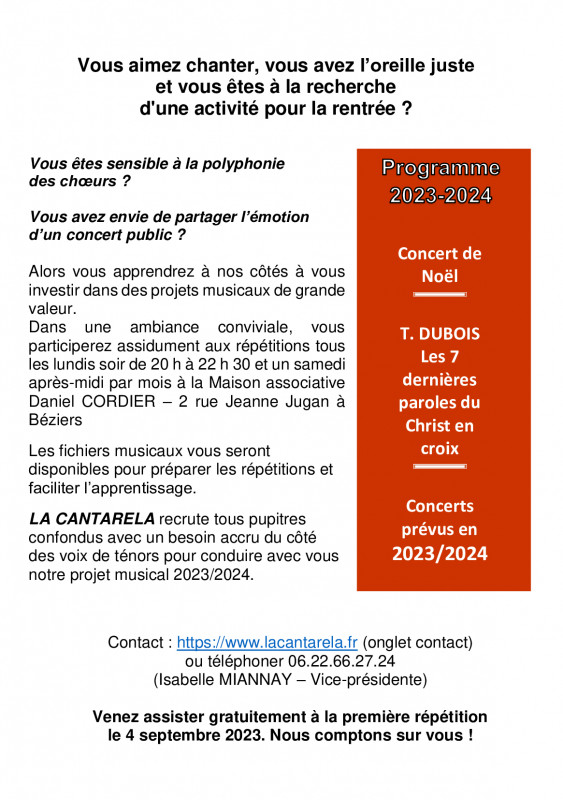 Nous recrutons dans tous les pupitres dès le début de la saison pour notre nouvelle saison et notamment des voix de ténors.